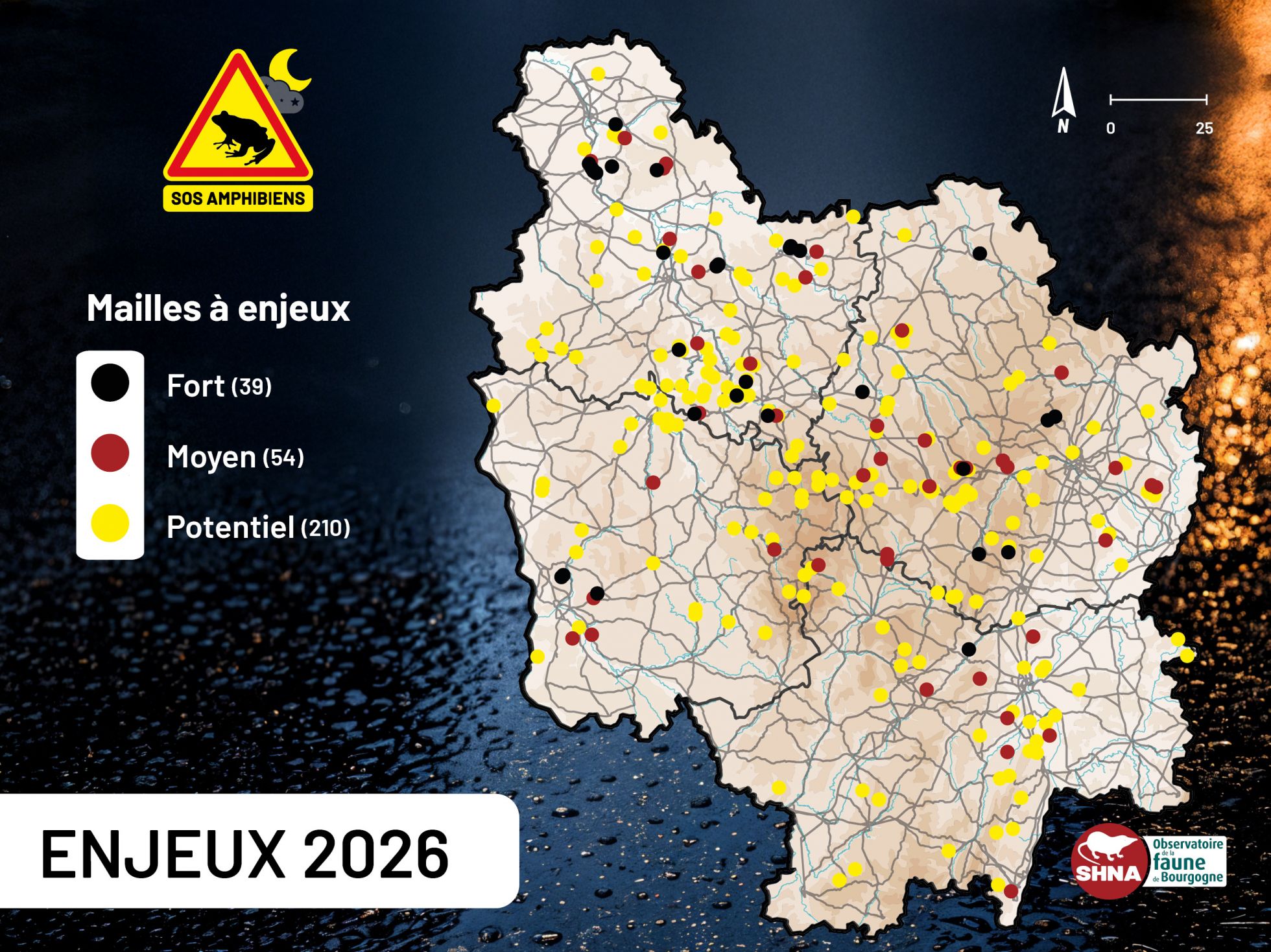 La SHNA-OFAB accompagne les initiatives locales par l’identification des zones à forts enjeux à partir de 20 ans de données sur les amphibiens routiers.