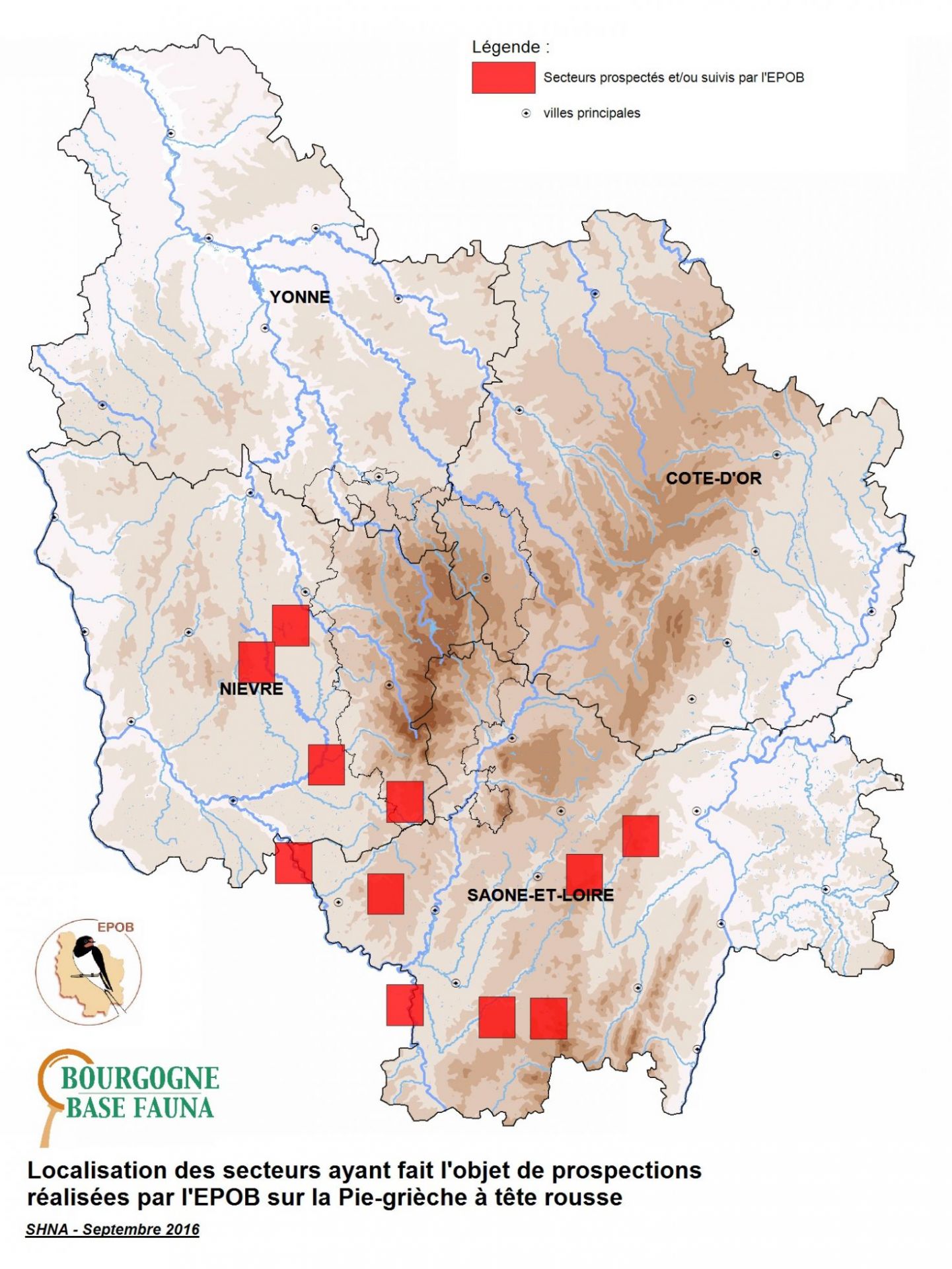 Un effort particulier a été appliqué sur la Nièvre. En effet, si la répartition de la Pie-grièche à tête rousse était à peu près connue, notamment grâce aux prospections dans le cadre de l’atlas des oiseaux nicheurs, cela n'était pas le cas des effectifs. Les dernières estimations donnaient un minimum de 55 couples pour le département, effectif que l’on savait largement sous-estimé. Pour avoir une idée des densités et donc des effectifs présents, des prospections ont été organisées sur deux zones échantillon de 36 km2 (6 x 6 km) dans le sud de la Nièvre où l’espèce est bien présente, l’une dans le bas-Morvan méridional et l’autre à cheval sur le Pays de Fours et le Bazois. En juin 2013, 27 naturalistes ont participé au recensement exhaustif de tous les couples à l’intérieur de ces 2 carrés échantillon.